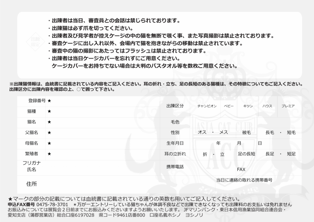 Home 2024-05-142025-11-19 猫籍登録・ACC公認血統書発行・キャットショー開催・猫に関する講習会、勉強会開催 キャットショー申請用紙ダウンロード 更新情報・2025/11/10 2026年2月14日(土)キャットショー千葉展開催決定 2026年3月 7日(土)キャットショー岡山展開催決定 *詳細は近日中お知らせいたします。・2025/10/20 アジアキャットクラブキャットショー北海道展結果追加しました。・2025/10/19 アジアキャットクラブキャットショー岡山展結果追加しました ペット保険